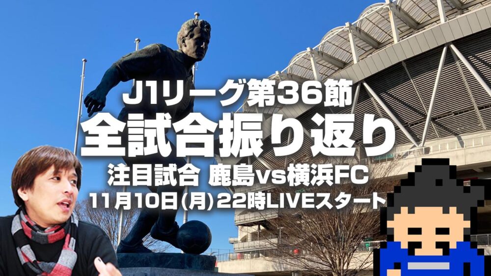J1リーグ第36節『全試合』振り返りLIVE(J1レビューショー)【11/10(月)22時スタート】 LINEHatenaFacebookTwitter 2025.11.10 11月10日(月)22時LIVEスタート予定 『Jリーグの今』を伝えるJ論チャンネル。 今回は ・河治良幸さん「サッカーの羅針盤」 ・MCタツさん「ロクダス」 上記サイトの2人が集合し 『J1リーグ第36節全試合振り返りLIVE』 などについて語るLIVE配信を行います。